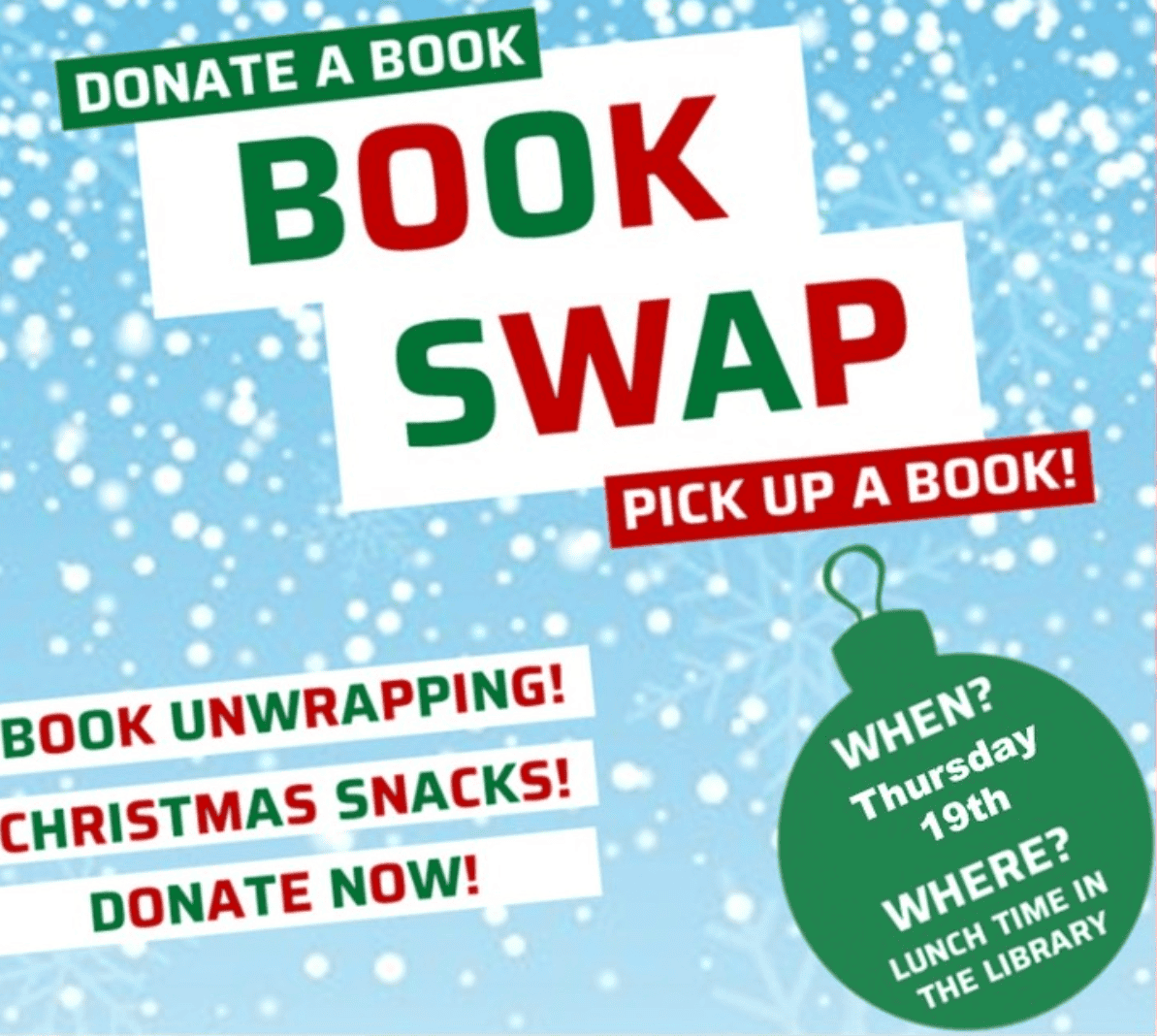We had a book swap party in the library on 19th of December at lunchtime. To be invited they had to bring a book to donate. Everyone brought a book to the library with them, whilst they had snacks, christmas fun and best of all lots of free books!